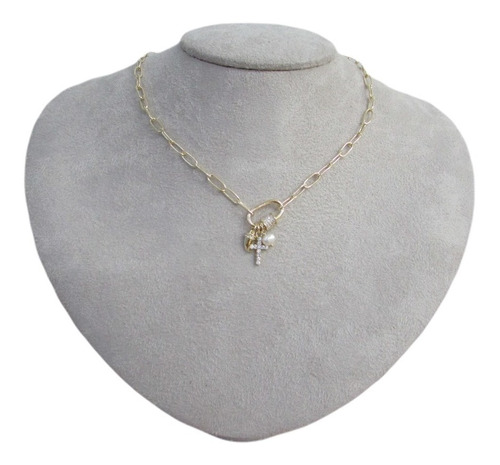 Colar Corrente Mosquetão Cruz Pérola Pedra Zirconia Semijoia