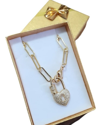 Colar banhado em ouro 18k, com pingente coração / cadeado com fechamento mosquetão de rosca cravejado de zircônias Tamanho do pingente 2,5 cm. Corrente com 45 cm. Acompanha caixa de presente. Uma linda peça para ser usada nas ocasiões mais importantes de sua vida ou para presentear. Produto a pronta entrega.