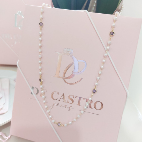 Colar banhado a ouro 18k, semi joia. Colar com pérolas e pedras de zircônia lilás, modelo Tiffany. 70 cm de comprimento. Semi joia com garantia de 1 ano. Uma linda peça para ser usada nas ocasiões mais importantes de sua vida ou para presentear. Produto a pronta entrega.