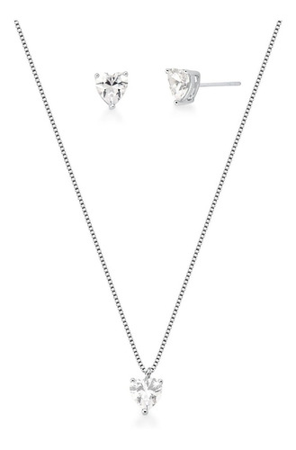 Conjunto colar e brinco coração em pedras de zirconia cravejadas. Folheado a prata com garantia. Colar com 40 cm de comprimento. Pingente e brincos com 0,8 cm de comprimento. Uma linda peça para ser usada nas ocasiões mais importantes de sua vida. Produto a pronta entrega. Incluso: 01 Colar 01 Pingente 01 Par de brincos Consulte o frete logo abaixo do valor do produto.