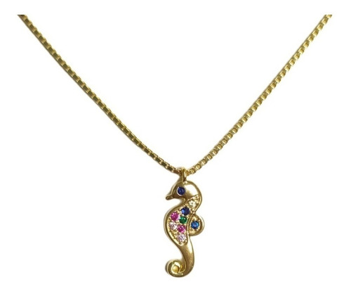 Colar folheado a ouro 18k, semi joia, com pingentes de cavalo marinho cravejado de zircônias coloridas. Colar com 40 cm. Perfeito para composições! Acompanha caixa de presente. Semi joia com garantia de 1 ano. Uma linda peça para ser usada nas ocasiões mais importantes de sua vida ou para presentear. Produto a pronta entrega.