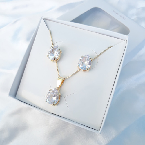 Conjunto Colar e brinco banhado em ouro 18k, semi joia, com pingente e brincos com pedra de zircônia em formato de gota. Tamanho do pingente: 2,0 cm (pedra com 1,2 cm). Tamanho dos brincos: 1,2 cm Corrente Veneziana diamantada com 44 cm + 4 cm de ajuste. Total de 48 cm Pedras de zircônia de alta qualidade. Acompanha caixa de presente. Semi joia com garantia de 1 ano. ESCOLHA A COR NO CAMPO INDICADO! Uma linda peça para ser usada nas ocasiões mais importantes de sua vida ou para presentear. Produto a pronta entrega.