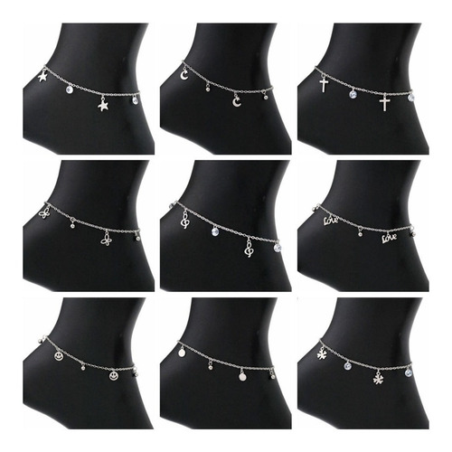 Tornozeleira em aço inox com pingentes e pedras de zirconia. Aço inox NÃO ENFERRUJA; NÃO FICA PRETA. 21 cm + 5 cm para ajuste. Total de 26 cm.